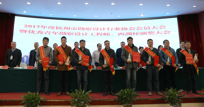 杨茂成处长宣读《关于公布杭州市优秀青年勘察设计工程师选拔和培养结果的通知》和《关于公布2017年度杭州市建设工程西湖杯奖(优秀勘察设计)评选结果的通报》。大会向王永成、刘恒新、余小马、沈华骏、陈赟、周翔、梁正峰、曹国强等8名优秀青年勘察设计师颁发证书和奖杯,向获得2017年度建设工程“西湖杯”一等奖的项目颁奖。