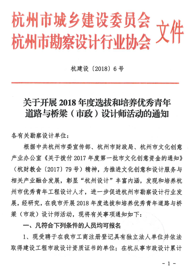 2018年1月16日,杭州市城乡建设委员会正式印发了《关于开展2018年度选拔和培养优秀青年道路与桥梁(市政)设计师活动的通知》(杭建设【2018】6号)。